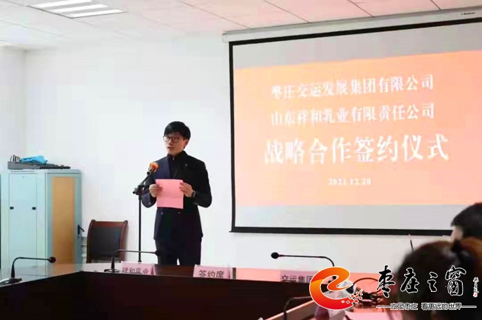 時近元旦,一元復始,萬象更新。12月20下午,山東祥和乳業(yè)有限責任公司與棗莊交運集團戰(zhàn)略合作框架協(xié)議簽約儀式在棗莊交運集團三樓會議室舉行。市國資委黨委委員、副主任孫晉卓,祥和乳業(yè)董事長闞久剛,棗莊交運集團黨委書記、董事長王賀龍出席簽約儀式并分別做了發(fā)言。